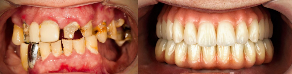 This procedure involves removing any remaining teeth, placing 4-6 implants per arch, and attaching a low-profile bridge to those implants. The implants are often placed at special angles to avoid the patient’s sinuses. This also avoids the need for expensive bone grafts, which require long healing times.