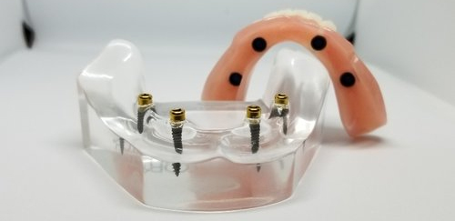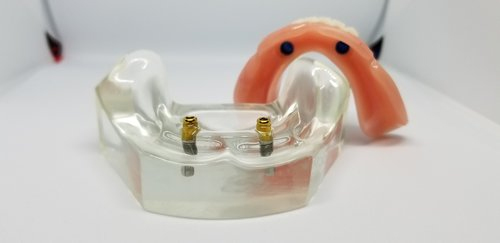 The denture removed from the simulated lower jaw shows the attachments in the denture as well as the implants and abutments in the lower jaw.